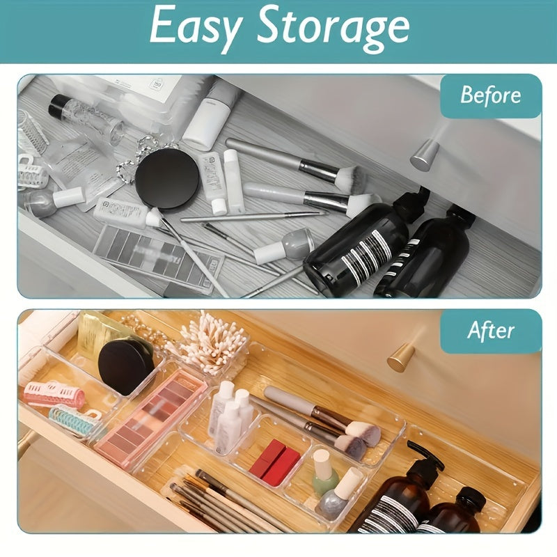 Keep everything organized - these transparent multifunctional drawer dividers and trays are perfect for any place in your home. Suitable for various drawers, such as dressing tables/bathrooms/kitchens/office drawers/craft rooms, very suitable for organizing cosmetics, makeup tools, hair accessories, jewelry, pins, office supplies, craft supplies, utensils, etc.