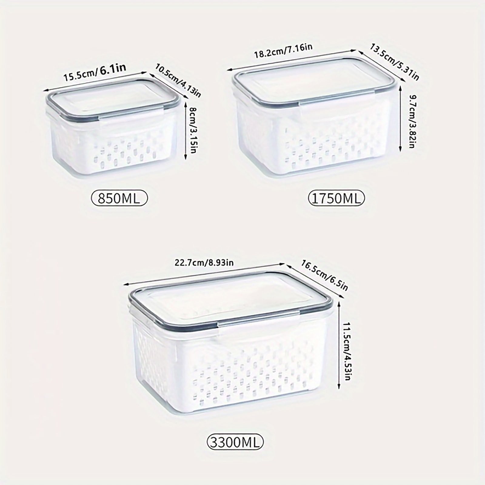 - 3 PACK FOOD CONTAINERS SETS: Fruit containers for fridge includes include 3 pack of large size 111 OZ (3.3L) + medium size 59 OZ(1.75L) +small size 28 OZ(0.85L). Various capacities perfect for most fruit, vegetable, lettuce, berry, cereal, meat, produce and other food storage. Perfect for most fridges, freezers, cupboards & drawers.