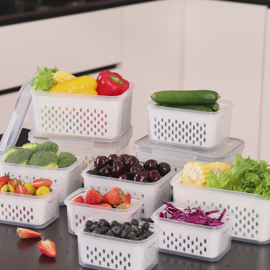 - BPA FREE & FOOD GRADE MATERIAL: Fruit and vegetable storage set are made of polypropylene material, BPA free and reusable, which can effectively resist stains & dust. Can be stored in the refrigerator, heated in the microwave, and washed in the dishwasher. (Please remove the lid before use the microwave or dishwasher.)